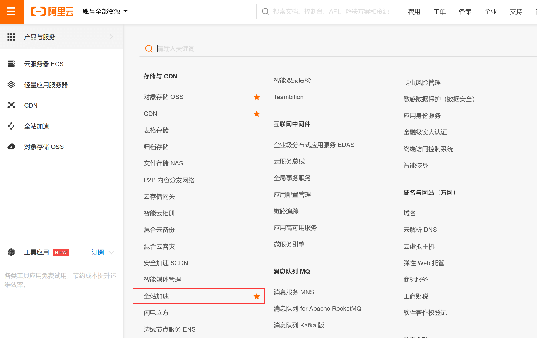 登入控制台后,找到全站加速,并且按提示开通对应服务